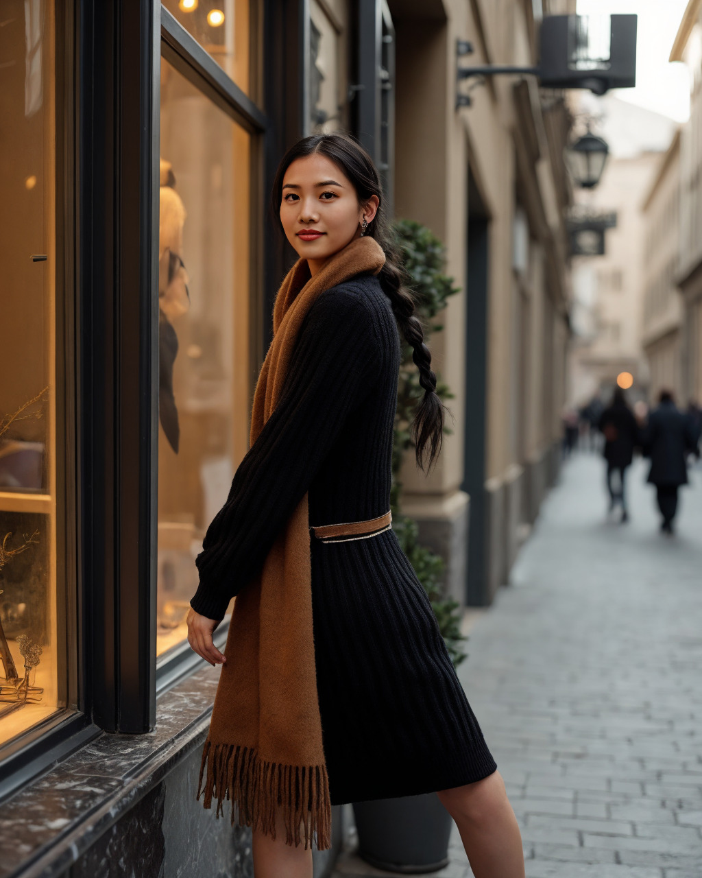 - Footwear: knee boots in black or deep brown.