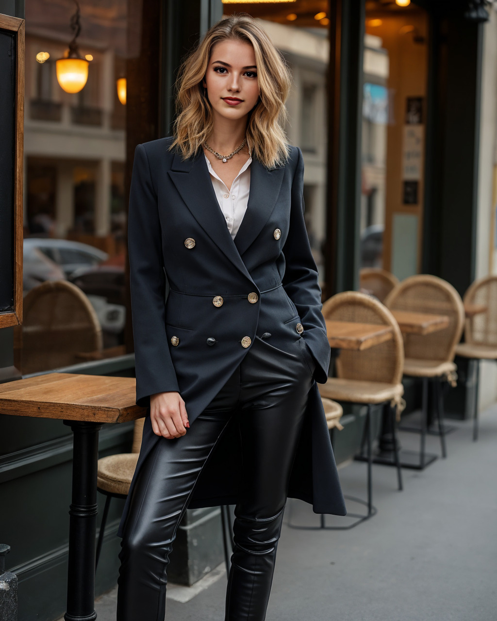 Stirrup leather leggings paired with a sharp, slightly structured blazer over a sheer mock-neck top are an instant “I’ve arrived” moment. Knife-point ankle boots, angular shades, and a bold cuff bring the drama.