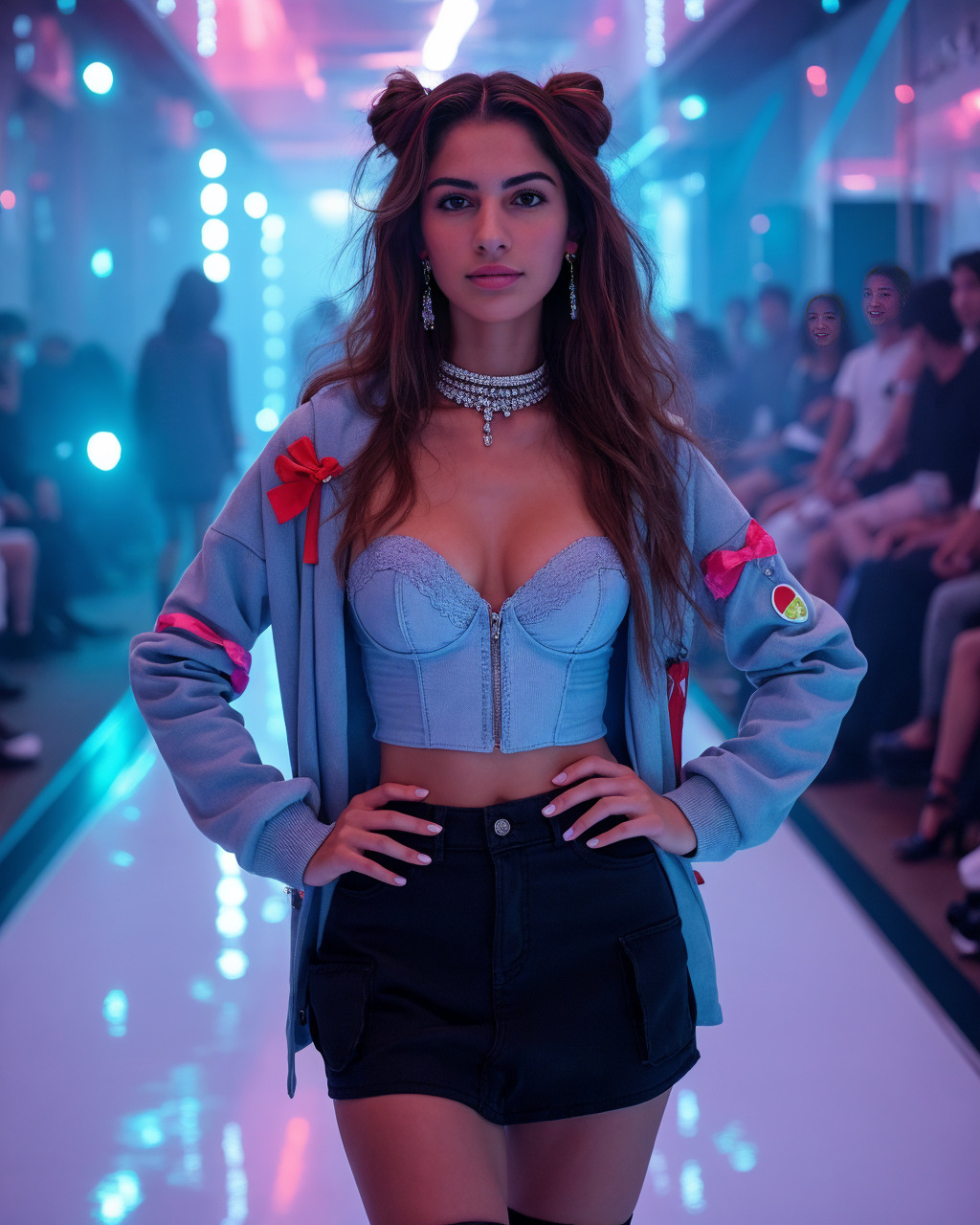Roller-Rink Kawaii: A corduroy romper over striped mesh nails the playful brief. Add a charm belt, ruffle socks, and chunky sneakers for function-meets-fantasy. It’s a look that’s just as photogenic gliding past rainbow lanes as it is queuing for merch.