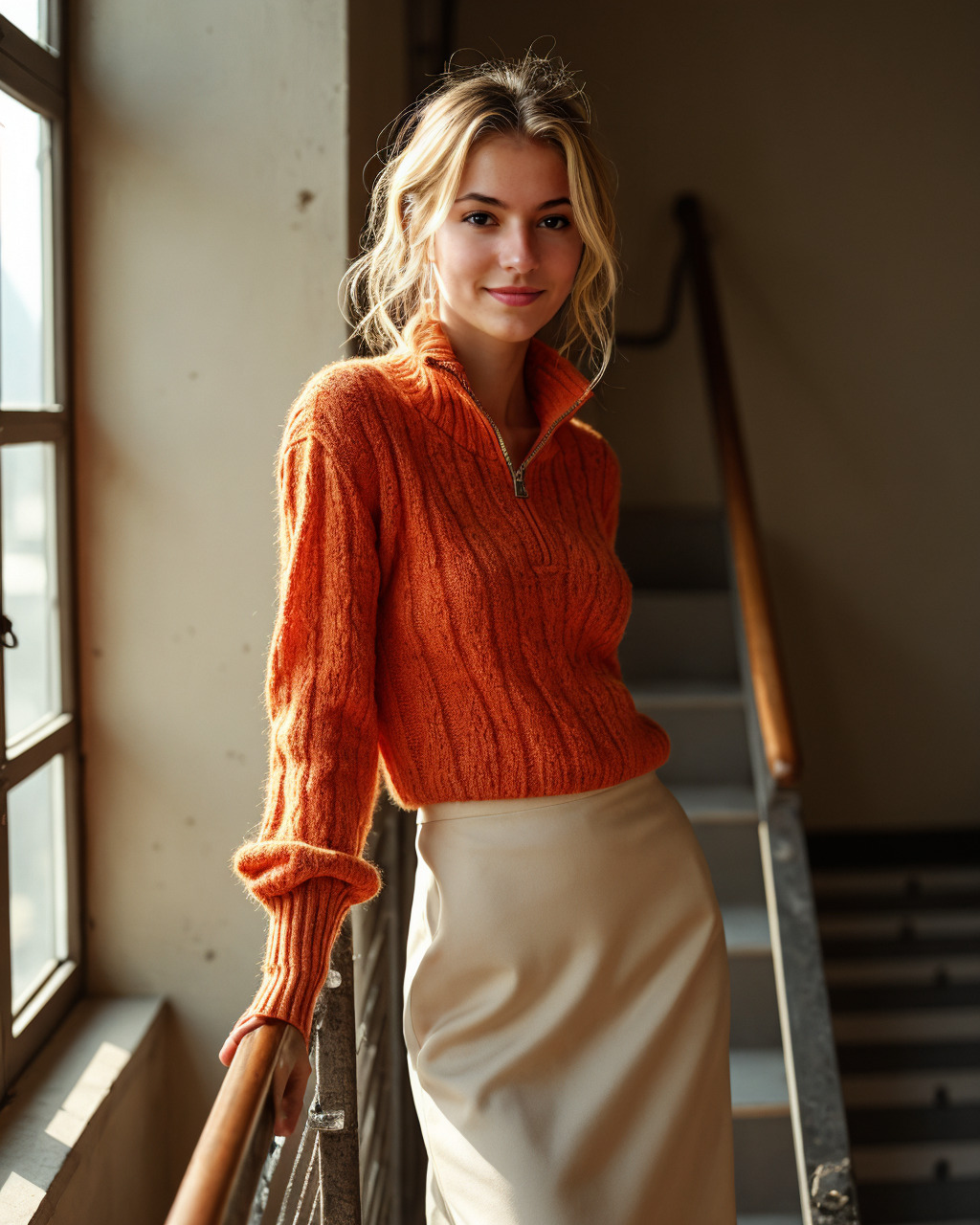 Opposites attract: pair a chunky half-zip or hoodie in a warm orange with a bias-cut silk skirt in bone or taupe. The knit brings ease; the skirt adds swish. Finish with slingbacks or ballet flats, and you’ve got an outfit that works for coffee dates, creative offices, and dinner without changing a thing.