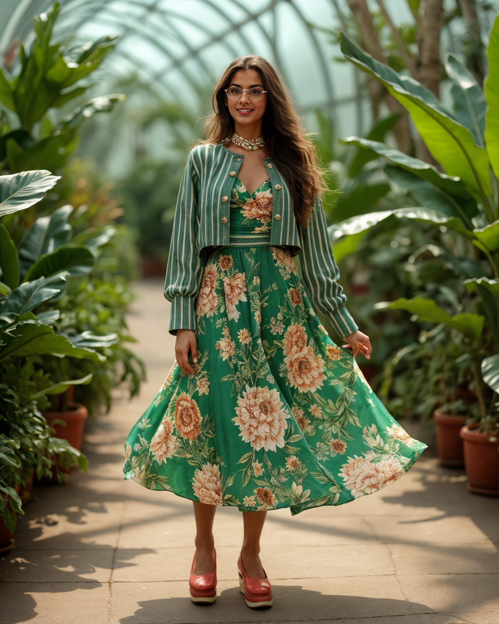 Print mixer, polished: Layer an emerald floral satin midi and a striped knit under a navy blazer with luminous buttons. The blazer acts as the anchor, allowing color and pattern to play without veering into costume. Finish with tinted lenses and a glossy platform shoe for a wink of drama that photographs beautifully.