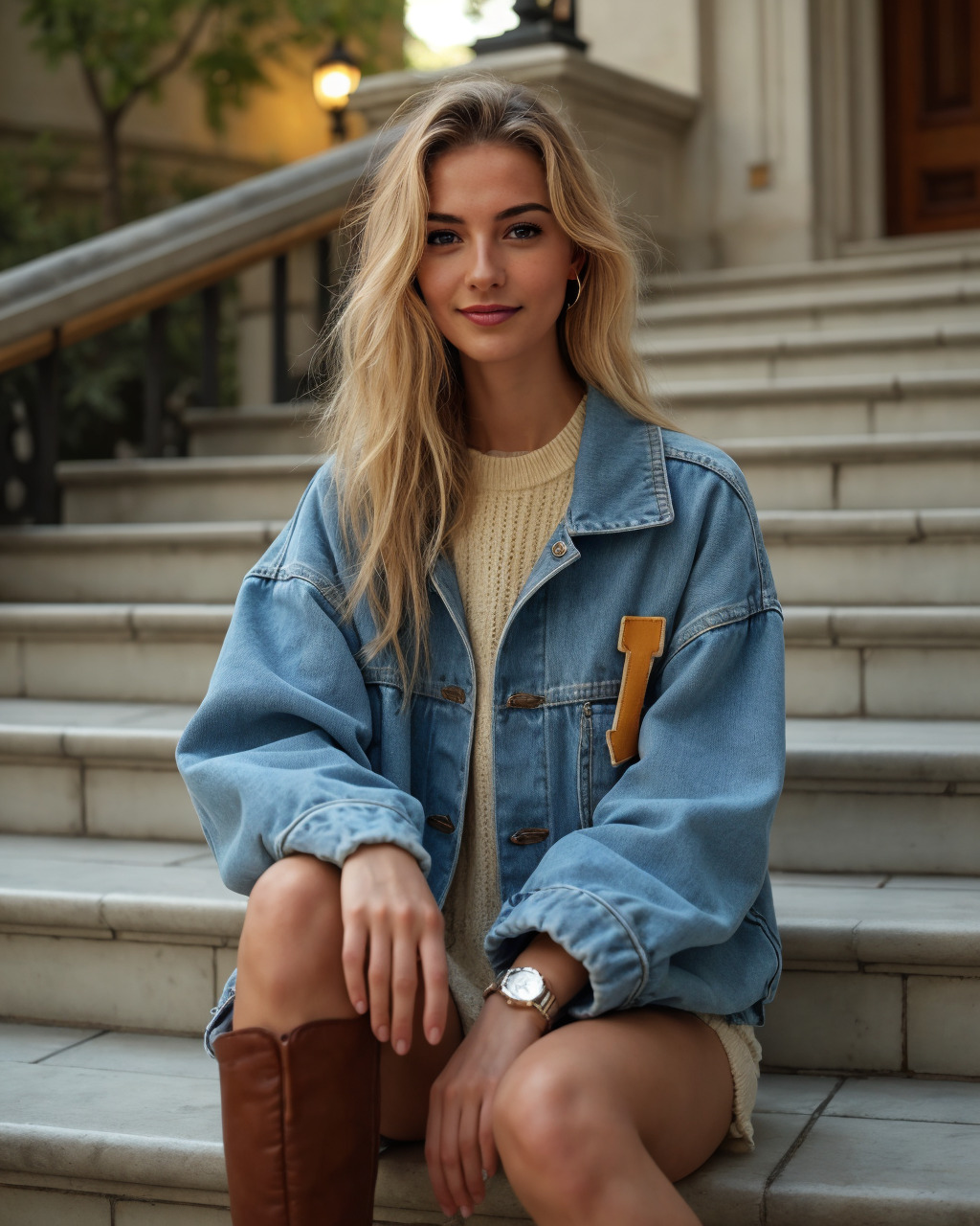 Day: Oversized light-blue jacket hugged over a cream cable-knit mini. Pearl studs, knee-high boots, flushed cheeks, and ribboned hair for charm.