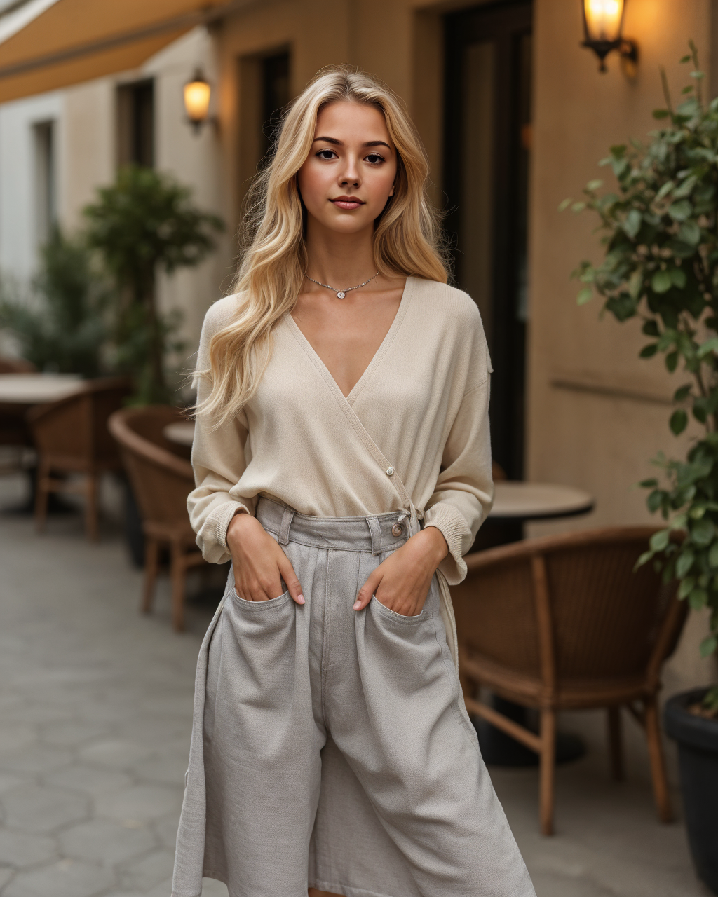 A ribbed cashmere co-ord set in oatmilk beige with ruching and shell button accents. Top with layered gold chains, bold sunglasses, and a printed mini scarf tied into your hair for a café-chic statement. - The Chunky Cardi + Culottes Combo: