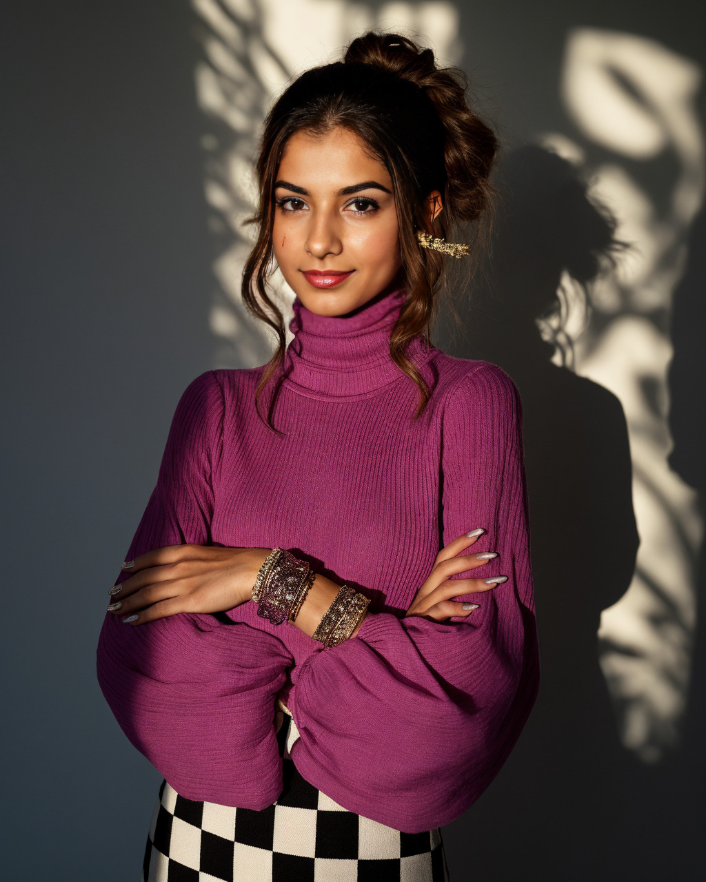 - Fuchsia knit with lantern sleeves adds volume up top; a checkerboard midi balances with structured geometry.