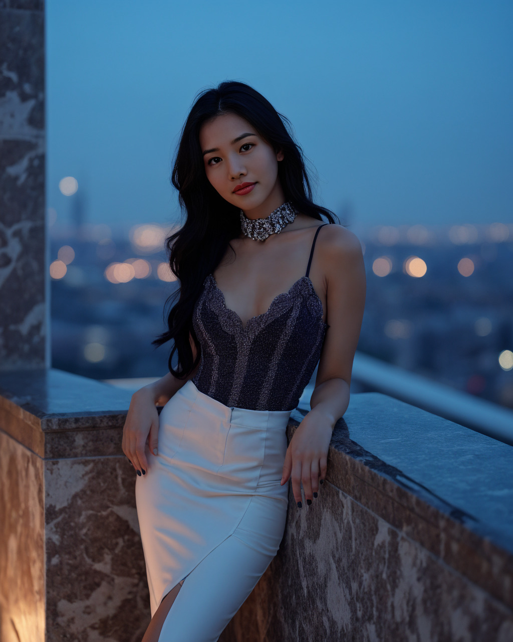Midweek called for a crisp white shirt reimagined with a sleek denim corseted layer over a sculptural white midi. Clean lines, sharp cuffs, and black mules. It reads head-down, getting-things-done—but with personality. By sunset, I floated a teal satin wrap over a white column skirt and tossed a leather jacket over one shoulder. Suddenly, spreadsheets didn’t stand a chance against skyline plans.