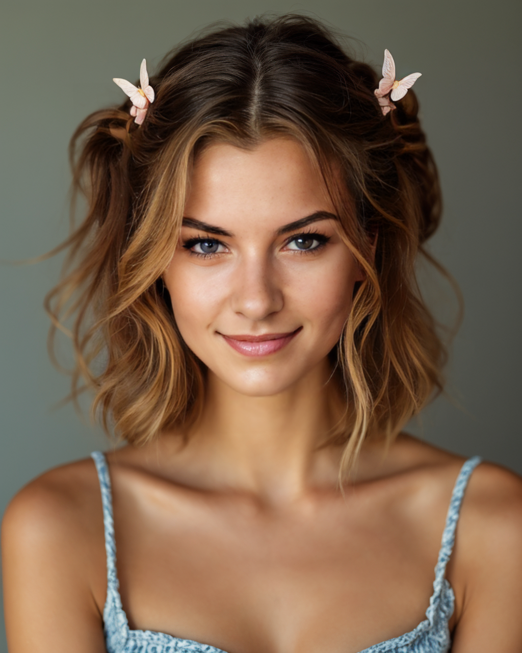 Soft waves are twisted into half-up pigtails and secured with tiny pastel butterfly clips, adding a whimsical charm to this warm honey-brown look. Ideal for wavy to straight hair types, it’s a go-to for everyday cuteness with a playful vibe. Great for birthday parties or casual outings.
