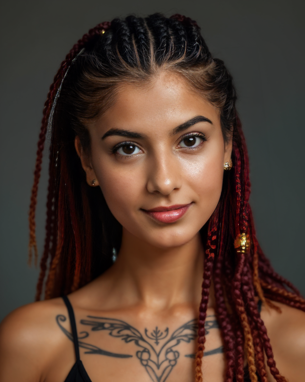 These medium-length box braids cascade in layers, ending in loose curls and shaded with a subtle burgundy ombré. The look is effortlessly natural with a twist of glam. Perfect for everyday wear, this style is great for those who want low-maintenance beauty with visual interest.