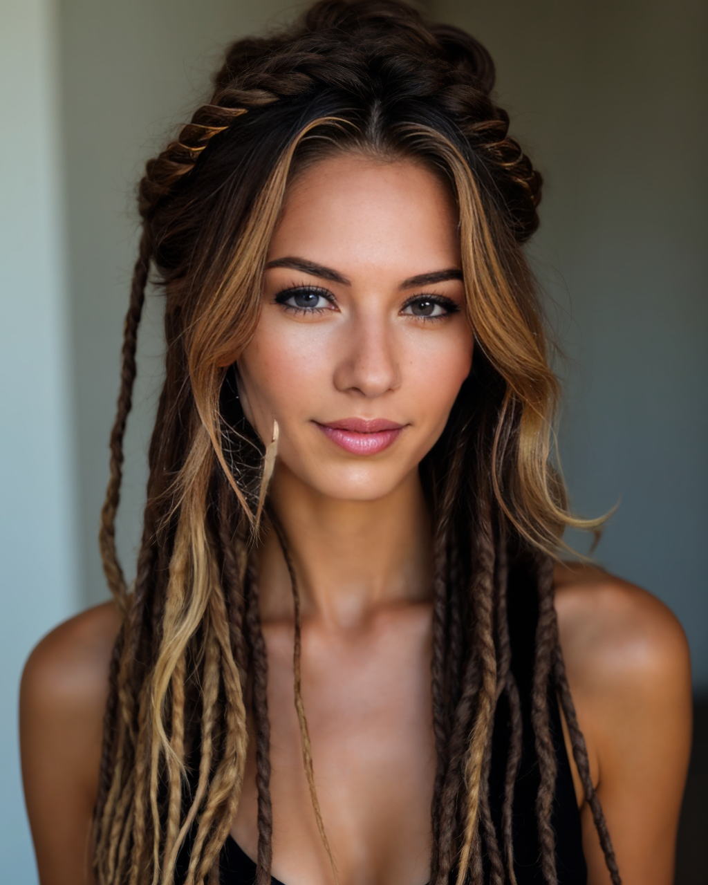 This soft updo gathers loosely wavy dreadlocks into a refined twist, with a few strands left free to frame the nape of the neck. Blonde-tipped ends add light and contrast to the rich espresso base. This elegant look exudes poise and works beautifully for formal events or special evenings. Great for medium to long dreads with a softer texture.