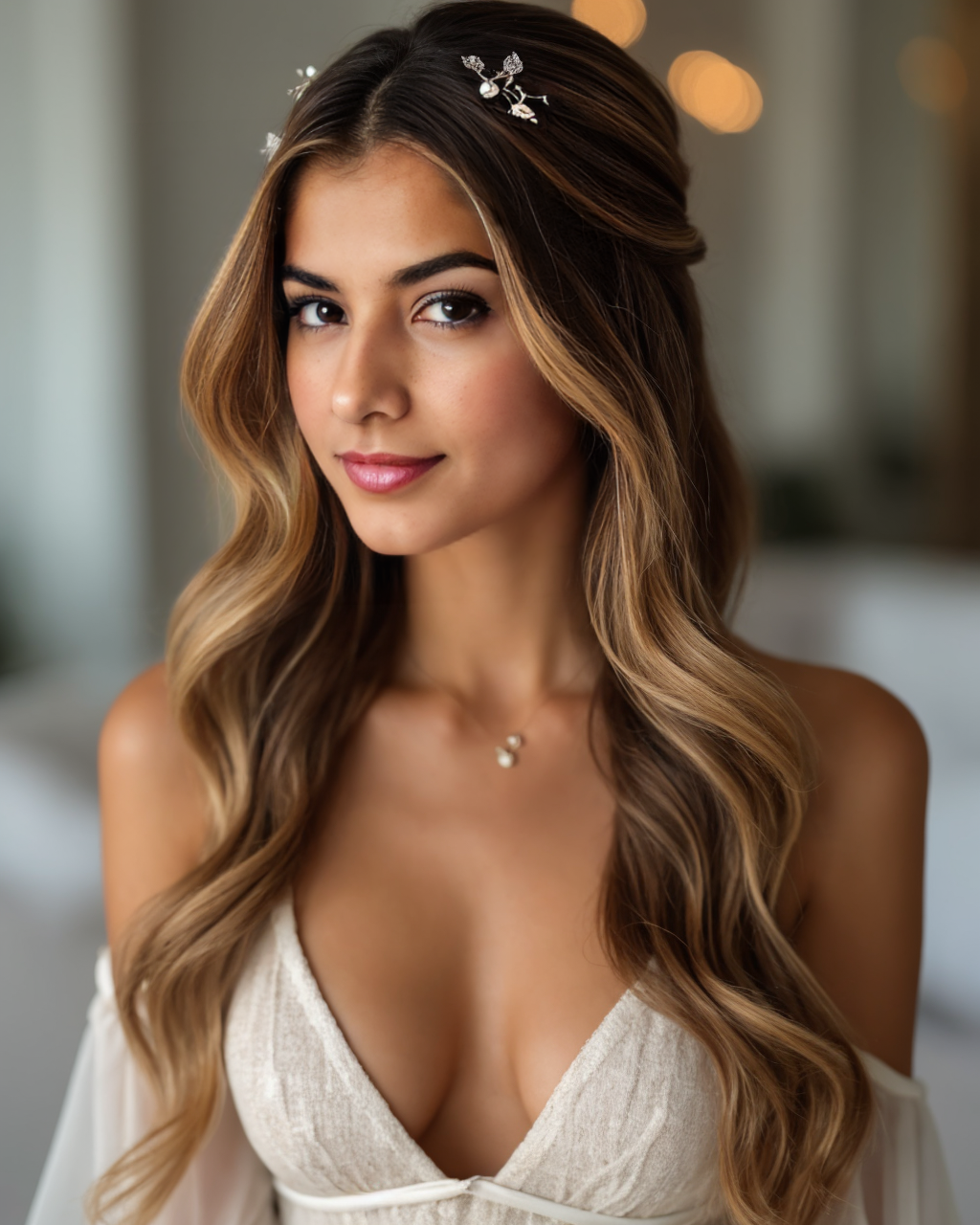 This style features a subtle crown twist paired with a soft side part, allowing waves to frame the face and fall naturally. Honey balayage adds warmth and depth, making the curls pop. Great for long, softly wavy hair, this look suits almost any wedding setting. The aesthetic is classic romance with a modern sensibility.