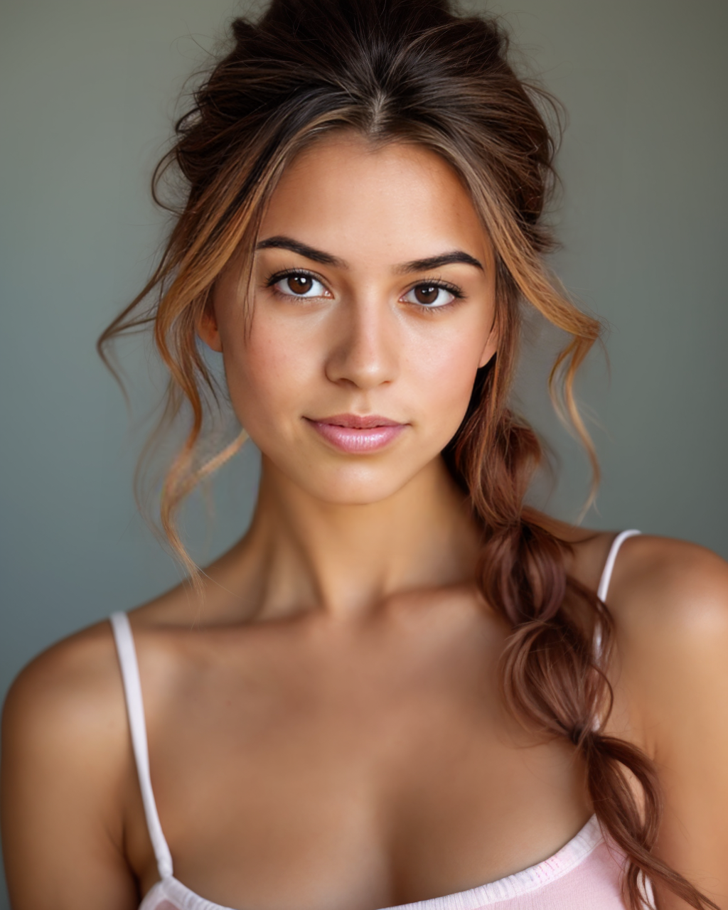 Make a statement with this high ponytail wrapped in a braided crown and tied with a velvet ribbon. The soft cinnamon gloss enhances the intricate detailing. Ideal for long, textured hair, this look is regal yet modern. Wear it to formal events, gallery openings, or anywhere you want to feel like royalty.