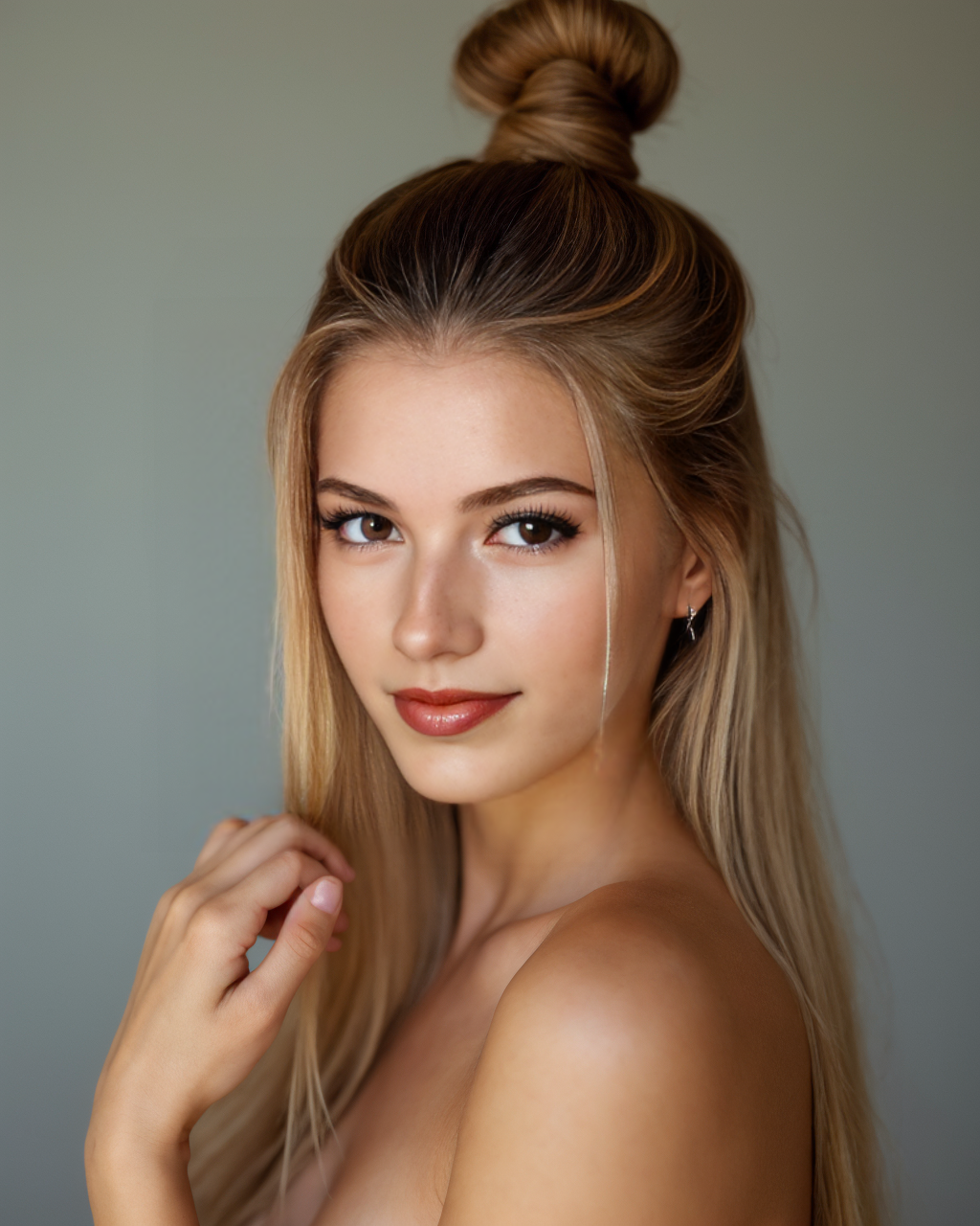 This voluminous bun sits high on the crown, sculpted into a smooth, structured shape that catches the light with a golden honey balayage finish. Perfect for grand entrances and dramatic gowns, it suits straightened or softly wavy long hair. The mood is regal and powerful—ideal for modern prom royalty.