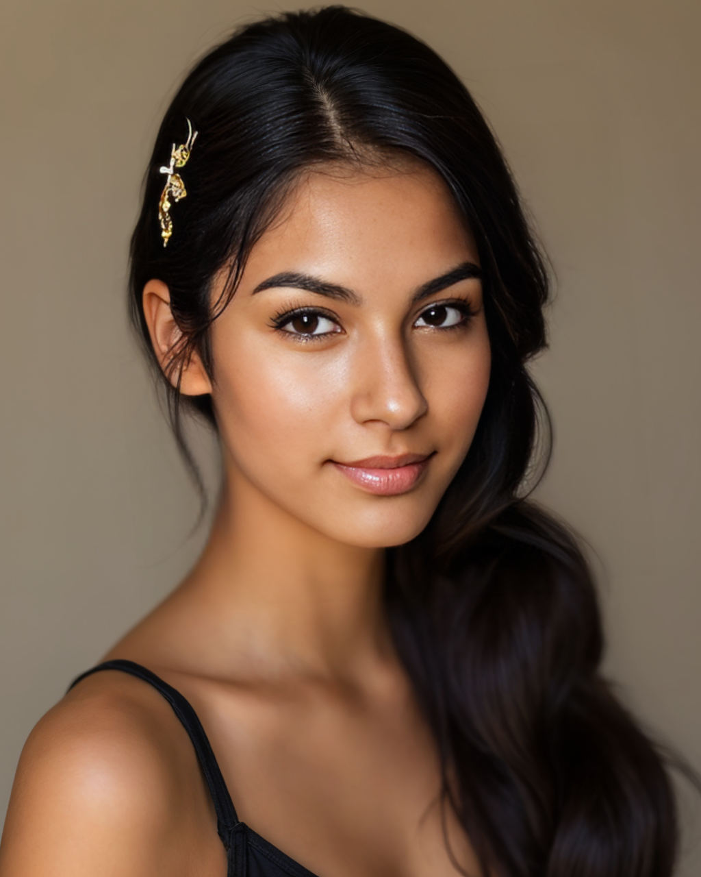 A sleek twisted chignon rests low at the nape, finished in a rich espresso hue and accented with a single gold pin. Understated yet elegant, this style whispers quiet sophistication. A go-to for formal dinners, work functions, or classy date nights.