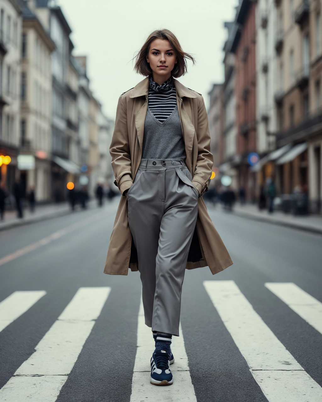 Stone trench, tapered dove-grey trousers, and a Breton knit meet navy motorsport sneakers. A short silk scarf with a racing-stripe motif and tonal socks extend the leg while the low outsole nods to pit-lane precision.