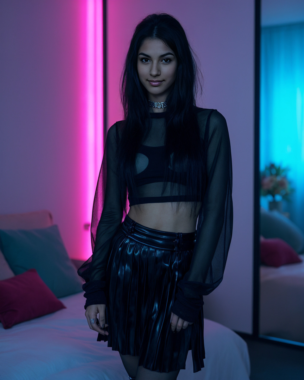 A sheer striped mesh under a cropped black tee paired with a razor-pleated micro skirt brings E-girl architecture. Platform combat boots, fingerless arm warmers, and a heavy chain choker amplify edge. Winged liner and an inky manicure sharpen the power stance.